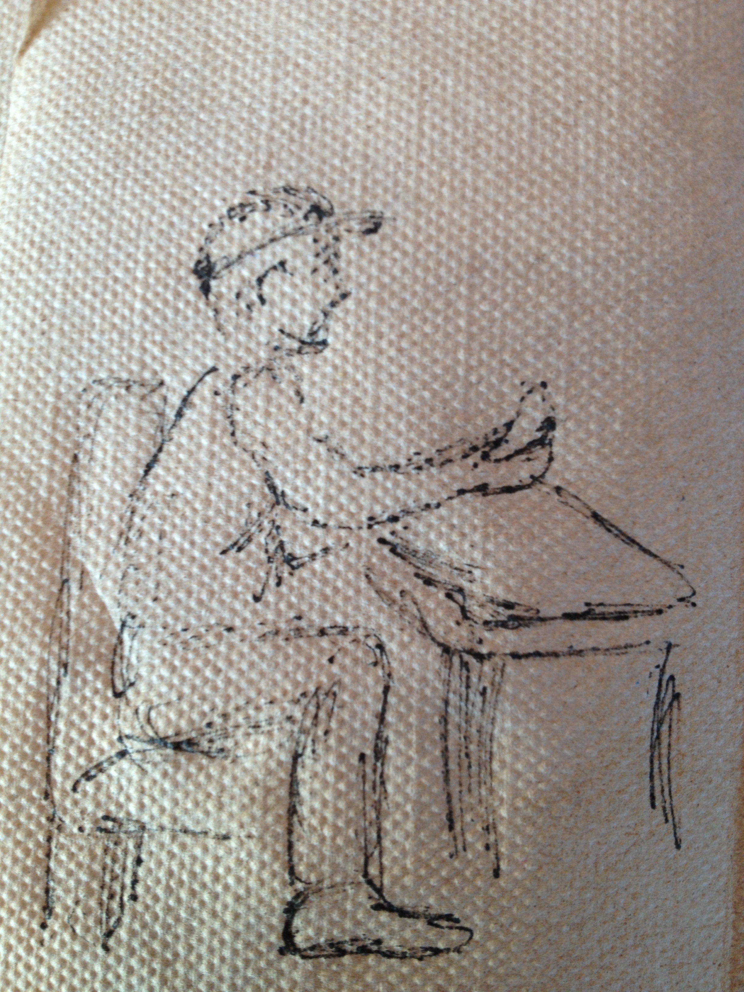 Still in Chicago with my Dad, and that essentially means I get no time to myself. I’ve been scrambling to produce art at the last second for the last few days. Tonight it became a real issue when he decided he wanted go to a movie. Don’t get me wrong, I’m only here for a few days and my Dad doesn’t get out much these days, but I have to keep at this project for myself, it has come to mean so much to me, and has done so much for me. We were sitting in a restaurant having a quick bite before the movie and I searched my purse for something to sketch on. I found a manilla tag, and used it to draw a quick picture inspired by yesterday’s walk in McDonald Woods, and then as I looked around the restaurant I saw a man who I thought was interesting. No more tags, but I had a napkin. A quick napkin sketch and I had a second piece of art. Neither piece of art is the best work I’ve ever produced, but the drive that produced them is what matters to me. Tomorrow I hope to have a few minutes to produce a finished piece, but there will be art, oh yes there will be art.