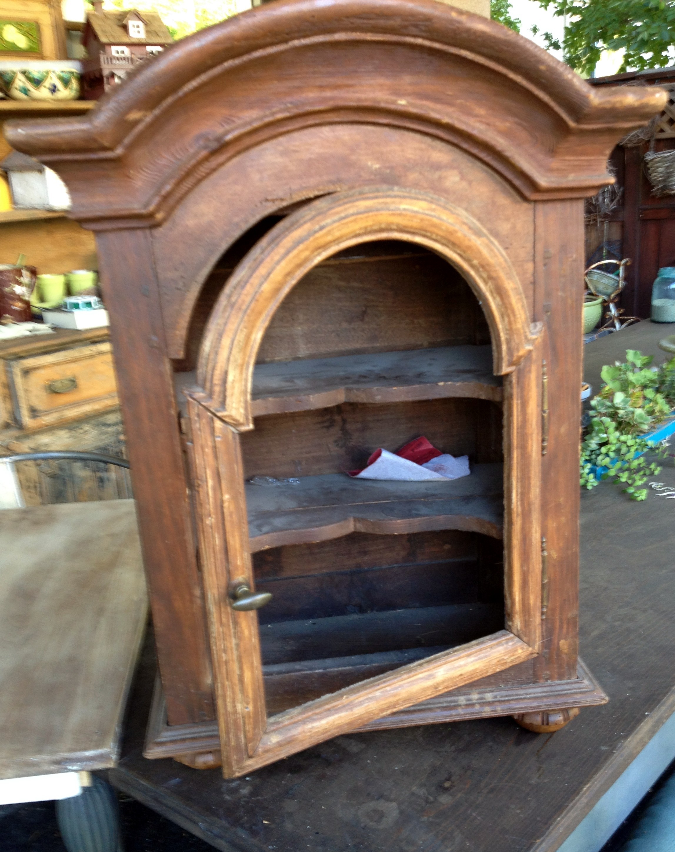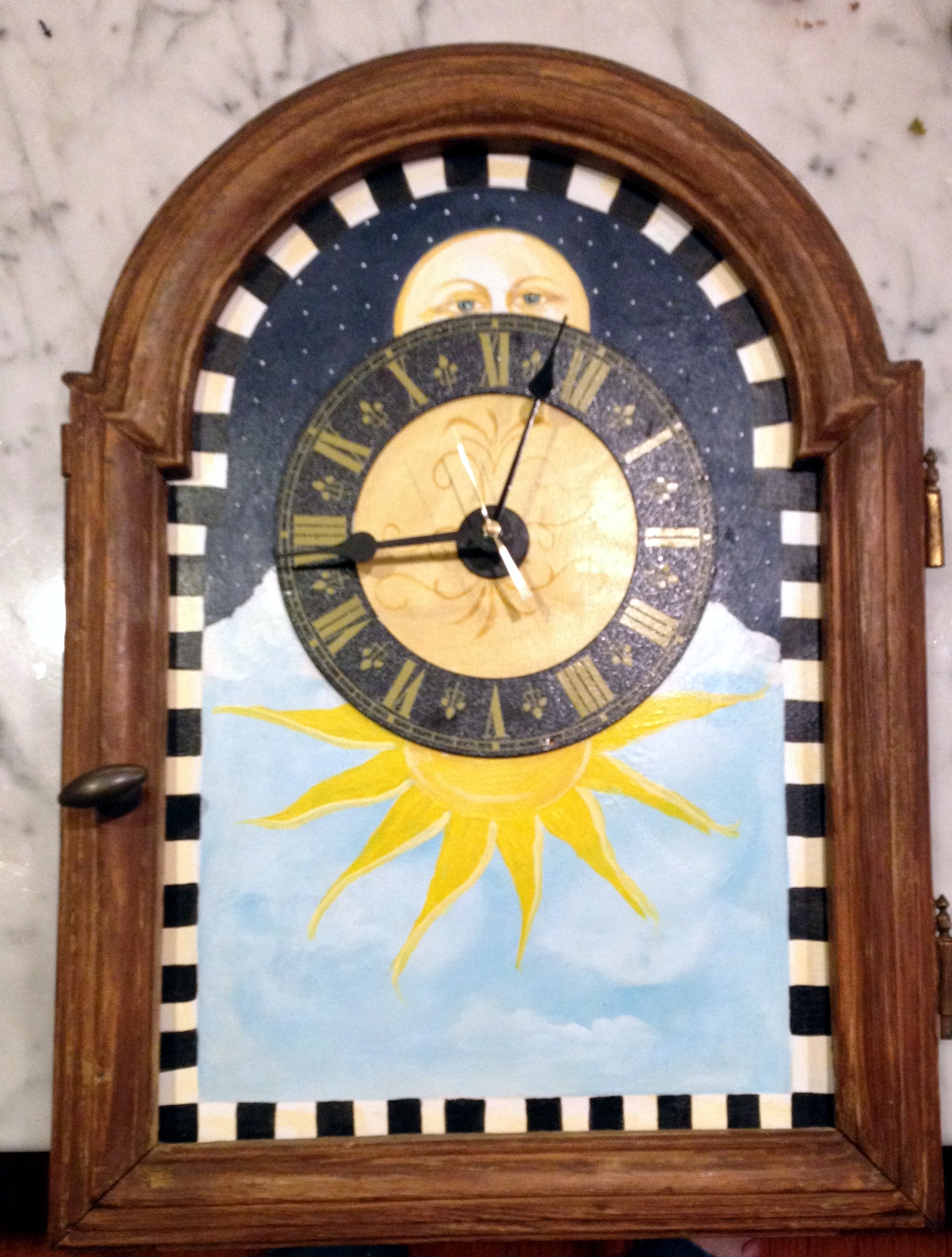 Two years ago for Christmas I received a beautiful little cabinet from Dan for Christmas. It was a great gift, it was the kind of gift where I saw it in a store and…bought it, called Dan, and  said, “You can give it to me for Christmas.” Like I said, it was a great gift. From the minute I saw this little cabinet I thought, “Grandfather Clock”. Now that we are embarking on our business I am taking all the ideas that have been laying in wait in the recesses of my brain and putting them into action. The crib/ bench was one of them. The next idea is my Grandfather clock/bookcase. The cabinet appears to have had glass in the door at some point in its life, but when I bought it the frame on the front was empty. My partner in life and in creativity, aka Dan, helps me bring my ideas to life. We went to the store and purchased wood to create a bookcase to put under the cabinet. Today we made that bookcase, and then laughed our behinds off. The bookcase is fine, but when you put the cabinet on top it becomes a clock for the Jolly Green Giant. It has to be eight feet tall. What can I say, sometimes I just don’t think. We need the bookcase, so it won’t go to waste. (Without the cabinet on top it is six feet tall.) Tomorrow we will be returning to the store to create the four-foot bookcase we need. Dan also cut a panel from MDF for the frame opening. It is my project for tonight. The clock face for my cabinet. I can’t wait to make the smaller bookcase in the morning and add it to my cabinet. I have some really great ideas to finish it off.10 22