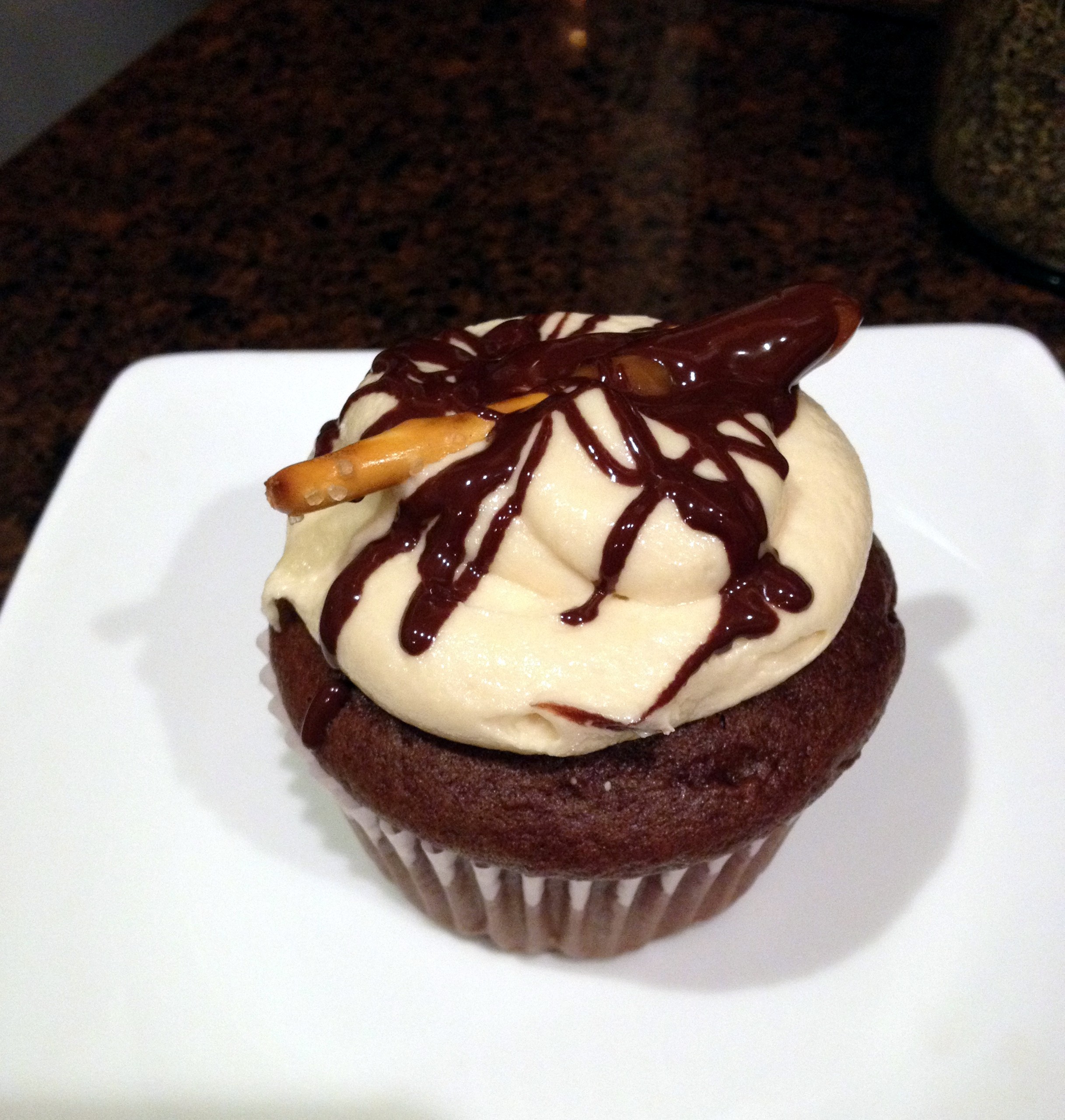 A little creativity in the kitchen tonight as well. A Devil’s Food cupcake with a Dulce de Leche butter-cream, drizzled with dark chocolate ganache, and topped with a caramel and chocolate dipped pretzel. Just one of the many treats we hope to have in our cafe.