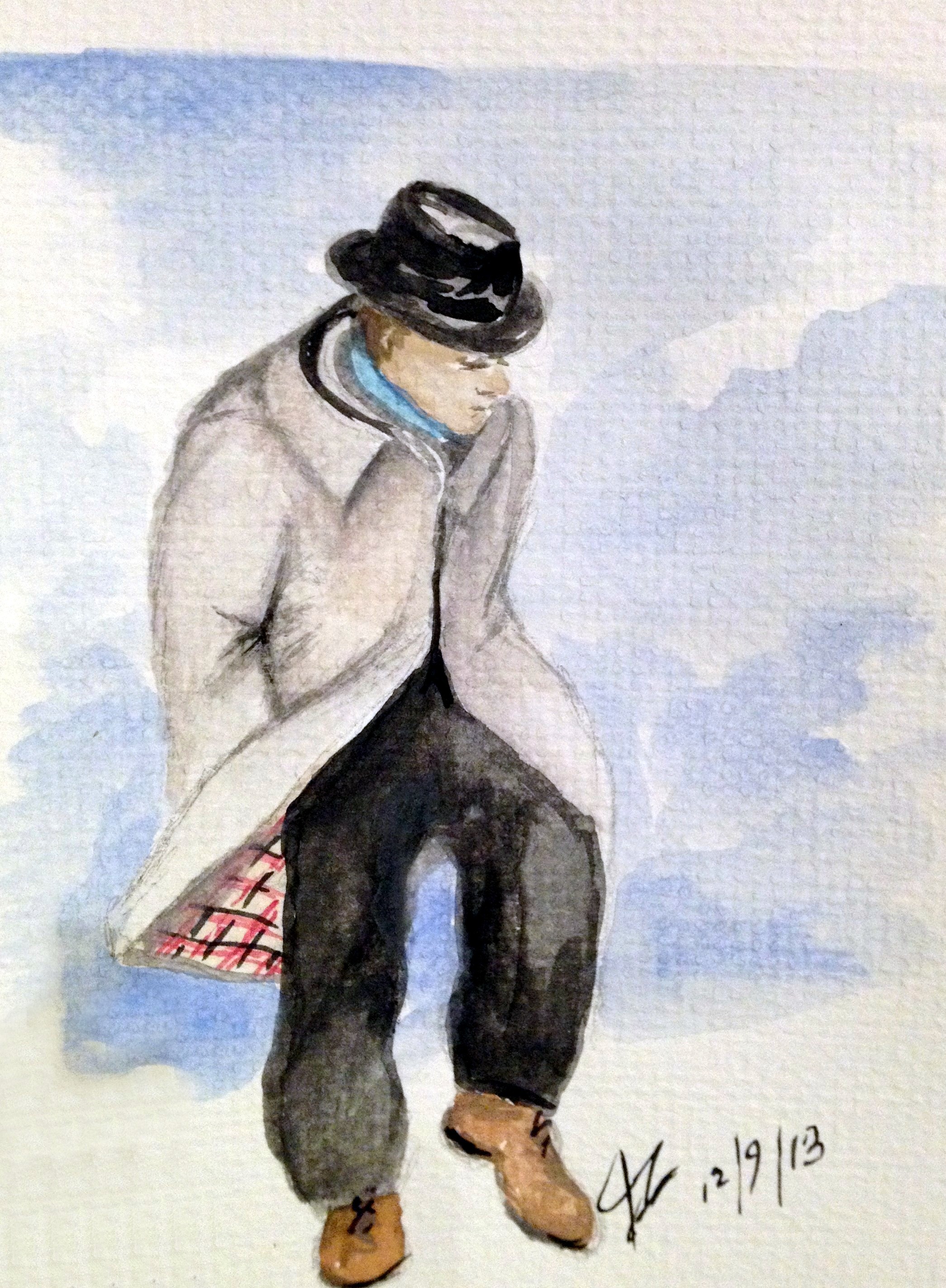 I finally took some time tonight to really sit and think about art for a minute, not craft (sorry fairies, you are art in your own special way, but….) I just haven’ t have the time. I’m still working towards Saturday’s show, and of course etsy sales, but I am craving the smell of oils, and even the frustration of the quick dry time of acrylic. I do however still have my watercolors. To be honest I am couch bound, old medical crap rearing its ugly head, so I am forced away from my workshop (formerly known as my dining room). It gave me the luxury of really thinking about what I wanted to paint tonight. Before I talk about the work and it’s inspiration I need to poke a little fun at myself. Regular readers know by now that I grew up in Chicago, the “Windy City”, and although that name actually came about not from the wind, but rather some boastful politicians and a World’s Fair, it really is windy there. When I was in college I found myself battling the wind as it caught the edge of my very large portfolio and spun me around. As I write this we are watching Monday Night Football, Chicago Bears vs the Dallas Cowboys. (The Bears annihilated the Cowboys in case you were wondering) I just checked the temperature, it’s eight,that’s eight degrees, and that doesn’t include the wind chill. Earlier today I was talking to my sister in Chicago and she said it was cold there. I said, “I know, it’s cold here too.” A light bulb went on, that’s when I said to her, “You’re probably about forty degrees cooler there aren’t you?” It was 50 here, yes 50, it was 10 there. It’s really, truly official, I am a “Wus” (is that a real word?), anyway…I was so cold earlier today that I was actually shivering, and it’s 50. I remember when I moved to California and made fun of all the “locals” who wore sweaters when it was 60. We had to run out for a doctor appointment earlier, when I felt the cold and the wind I announced to Dan that I can never live in Chicago again. I love Chicago, and I would of course have to amend the “never living there again” statement were I ever to be able to afford that downtown loft I’ve always longed for. Even then I would live in my loft for spring and summer only. I am so acclimated to the warmth of Southern California that I can no longer handle the cold. Yes, Wimp, that’s me.