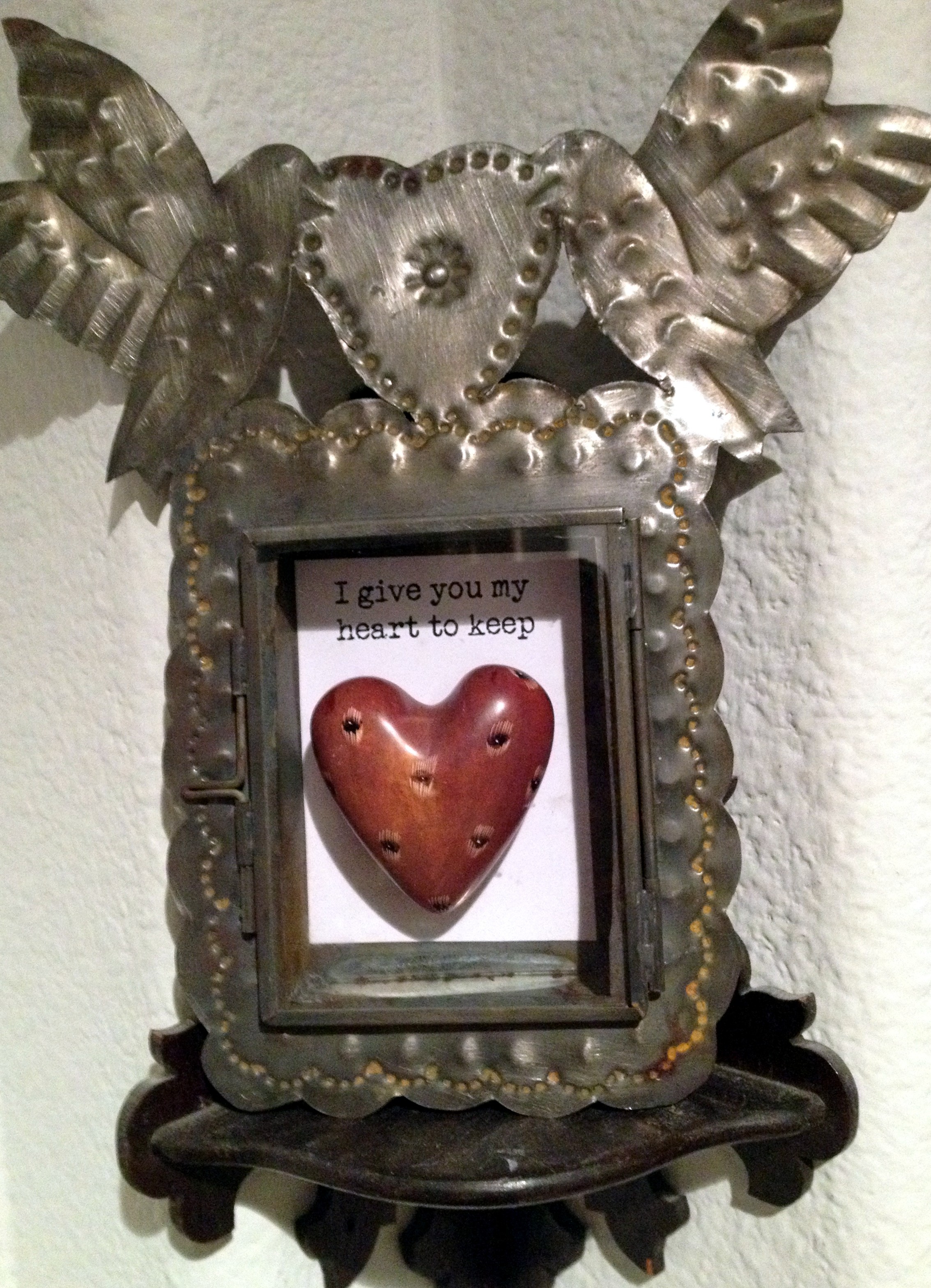 Last night I was juggling three projects. Tonight I’m down to one. I’ve put my suitcase box idea off for a day in order to cook something special for Dan for Superbowl Sunday. I focused on finishing the keyhole box, and I am again very pleased with my results. Instead of painting over the metal finish I added a scan of one of my vintage French postcards, and then on the other side I decoupaged a beautiful photo I took a few years ago. It is of a bouquet of dried roses and hydrangea. The photos are just beautiful and I’ve used them on several projects. One more vintage postcard, and the glue and burning metal technique for the back.