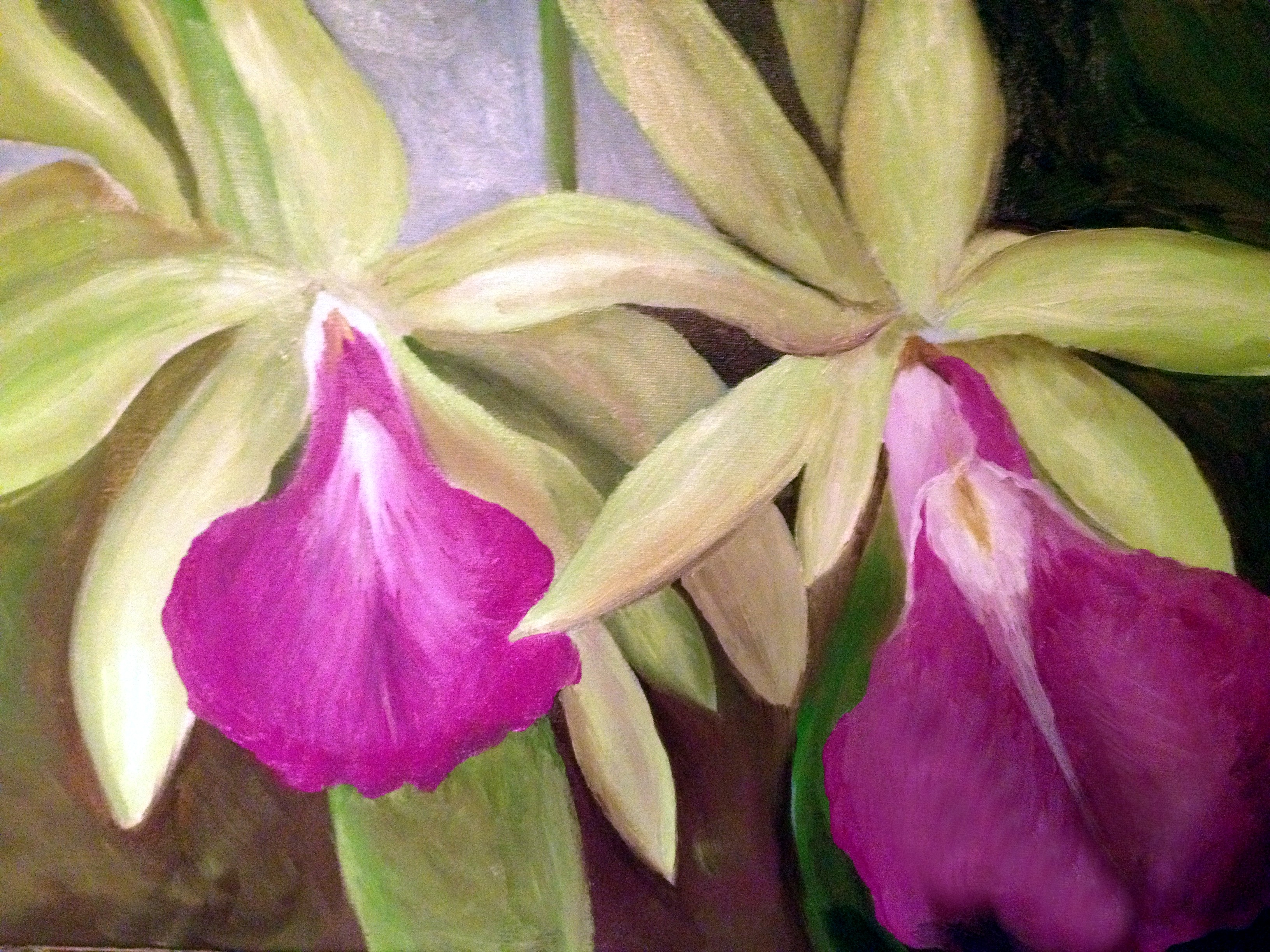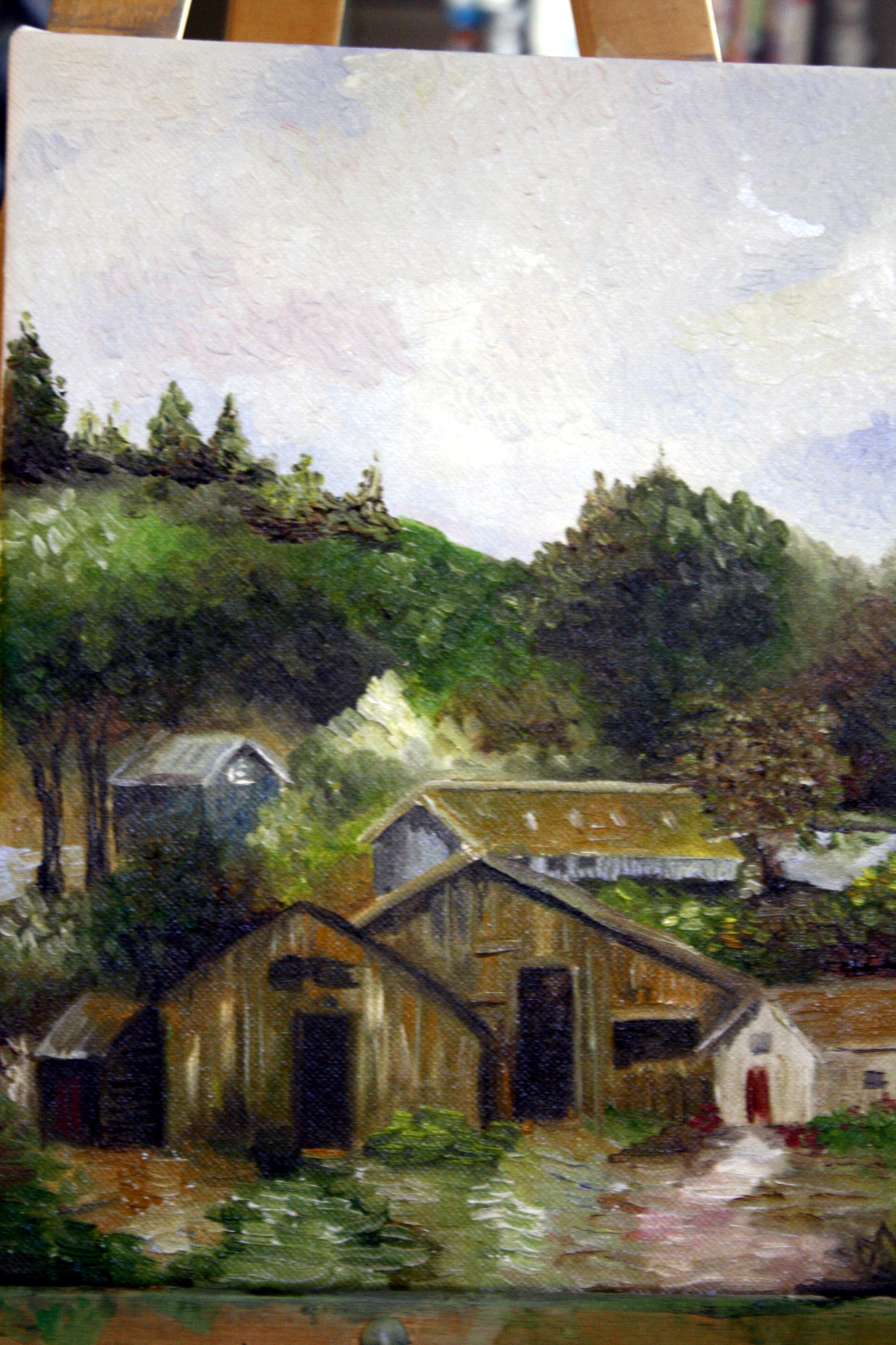 Dying of curiosity yet? Several blogs ago I referred to my extremely bad habit of painting where ever, wearing what ever, ruining many pieces of clothing in the process, not to mention a piece of furniture or two. There is also the olive-green carpet that was christened with a squirt of hot pink acrylic. My huge artistic advancement? When I decided it was time to paint today I was wearing a white t-shirt and a beautiful blue and white floral skirt. I set up my paints, my easel, and was about to pick up my brush when I stopped myself. I thought, “What are you doing?” I went upstairs and put on an old t-shirt, a pair of jeans (the victim of a previous paint), and went back down to go to work. When I mentioned to Dan that I felt like I’d made an advancement in my art, he took one look at me and laughed, he knew exactly what was different. Maybe not the most exciting news that you’ve heard today, but for my husband probably the best news he’s had in a while.
