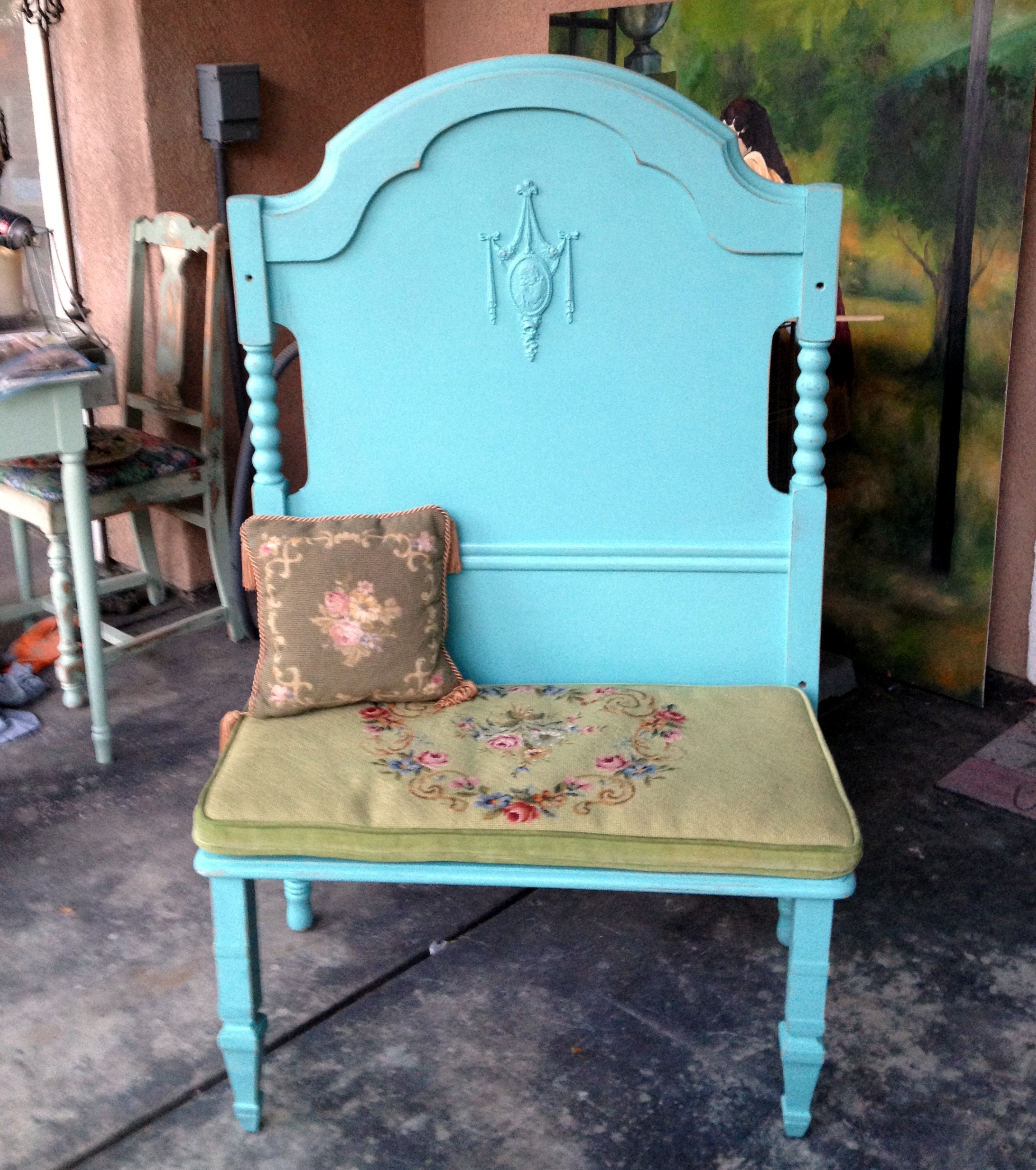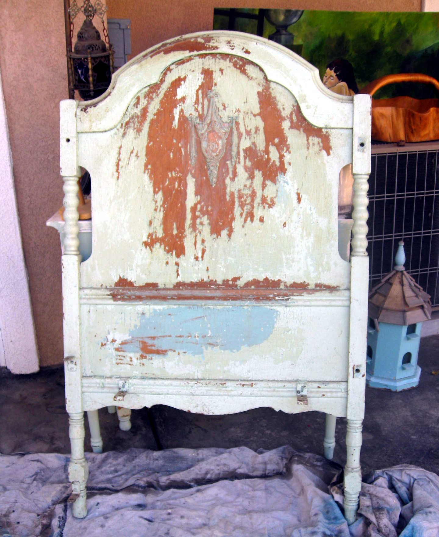 I’m not really distressed, but my project will be by tomorrow night. The marriage of my two pieces finally took place today, but we aren’t quite at the honeymoon stage yet. The crib panel is too large in proportion to the height if the seat. I have a number of solutions in mind, one of which I may attempt tomorrow. For now the piece is painted, but even that isn’t where it will end up. You may have noticed in the before photo that the color is similar to the color I started with, that is purely coincidental. I am trying to work with what I have on hand. That color was in the garage. The finish will look different tomorrow when I have my way with it. I don’t like new and shiny, never have. I love vintage and time-worn. There is very little in my house that is new, most of what I own is vintage. In my armchair psychologist best I believe it has to do with my longing for family connection. Growing up many of the kids I knew had grandparents, I didn’t. My grandfathers had both passed away when I was very young, and both were living in Ireland, as were my grandmothers. I met my Mother’s mom several times, and we stayed at her house in Ireland for a few weeks when I was thirteen, but we were never with her enough to really get to know her. I knew my other grandmother slightly better. She had tried to live here in the States but only lasted a few months. I was only five or so at the time, the thing I remember most was that she sat in my rocking chair all the time and I wasn’t happy about that. When I grew older I wrote to her, and on my last visit to Ireland in 1983, I spent some time with her at the home she was living at. She died a year later. I think I’ve spent my life searching for that connection to the past. I know there are people who hate antiques. For me I appreciate that the piece has a history, a story, that it was loved enough by someone to still be around. When I finished painting my bench it just looked too new. So, after all my hard work of stripping and sanding, and adding a fresh coat of paint, I grabbed the sandpaper once again and went to work distressing. Tomorrow I will be taking it a step further by adding an antiquing glaze. I love that aged distressed look, kind of like me.10 19