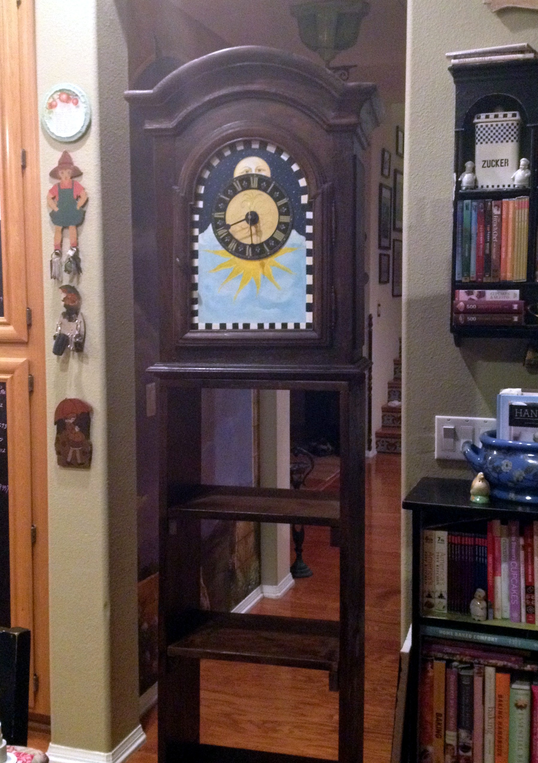 Did you ever start a project that seems so simple and straightforward, but then it turns into a never-ending nightmare where things keep going wrong? It happens quite a bit when you fly by the seat of your pants, and when your brain is a little muddied with stress. Feeling no control in you life when you are a very controlling person can really throw you off your game. I’m also one of those people who never measure. I eyeball everything I do. It drives Dan crazy. He measures and then measures again, and then he will recheck his rechecked measurement. I just do it and if it doesn’t work out I do it again. This of course leads to multitudes of nail holes, lots of wood putty or spackle, and lots of sanding. Twice as much work just so I don’t have to use a ruler. (I swear it’s because of math. It ruins my life) I spent the day working on my grandfather clock/bookcase.  It’s coming along, but as always it’s not quite right, but I like things a little off kilter, just like me.