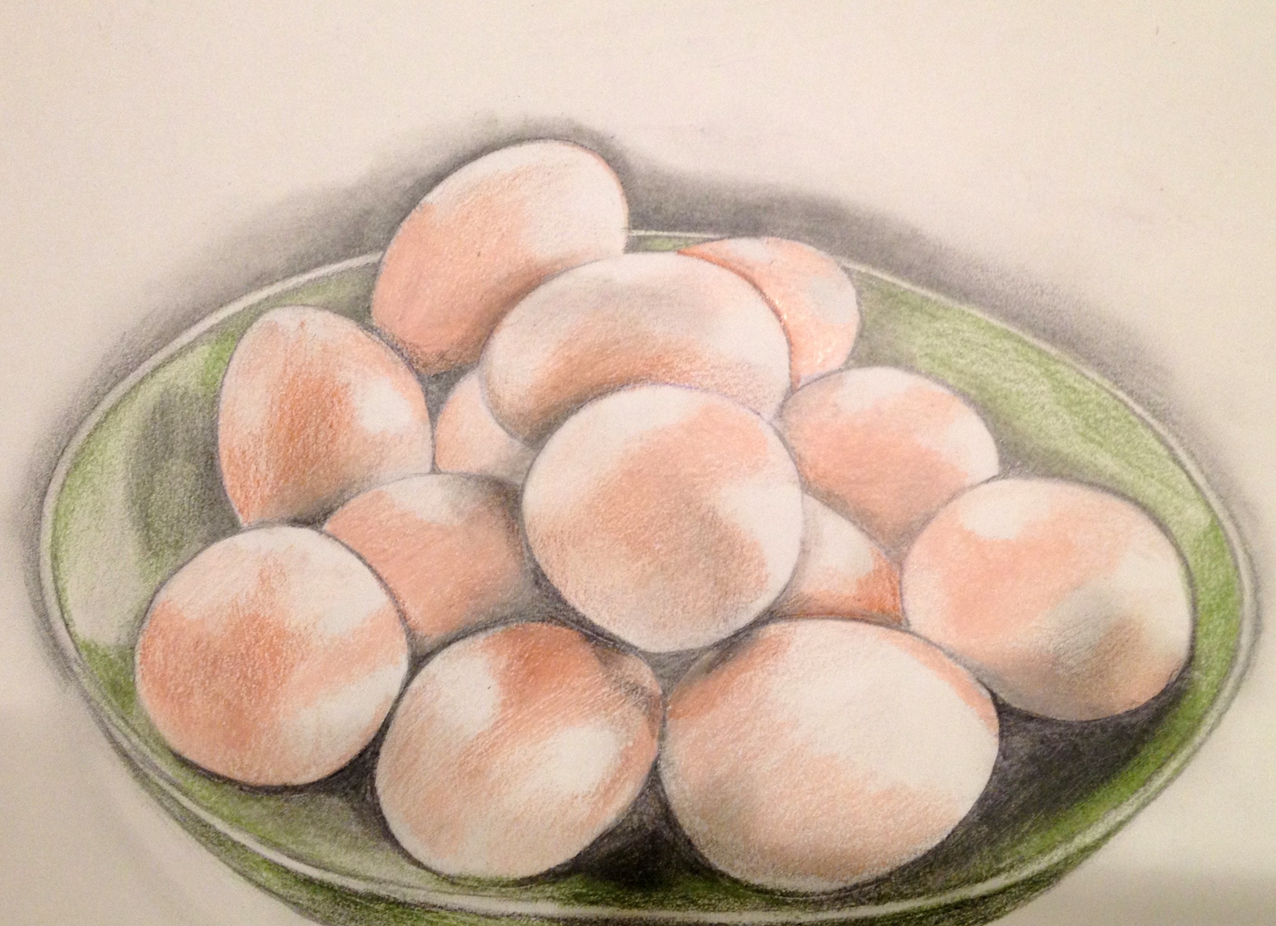 I mentioned a while ago that I do enjoy drawing and or painting regular objects. I thought about what I wanted to do tonight and remembered a photo I snapped one Saturday after a trip to the Farmer’s Market. A bowl of fresh eggs. I was originally planning a watercolor, but when I went into my studio I saw my colored pencils and realized I haven’t used them in some time. Tonight a bowl of eggs in pencil. I’m a little rusty. I haven’t taken the time to keep my drawing skills up to par. I have been toying with the idea of filling a sketchbook with some practice drawing, forms and such. I may just have to do that while I’m staying off my feet. Time to attack a mountain of a different kind.1 2 14