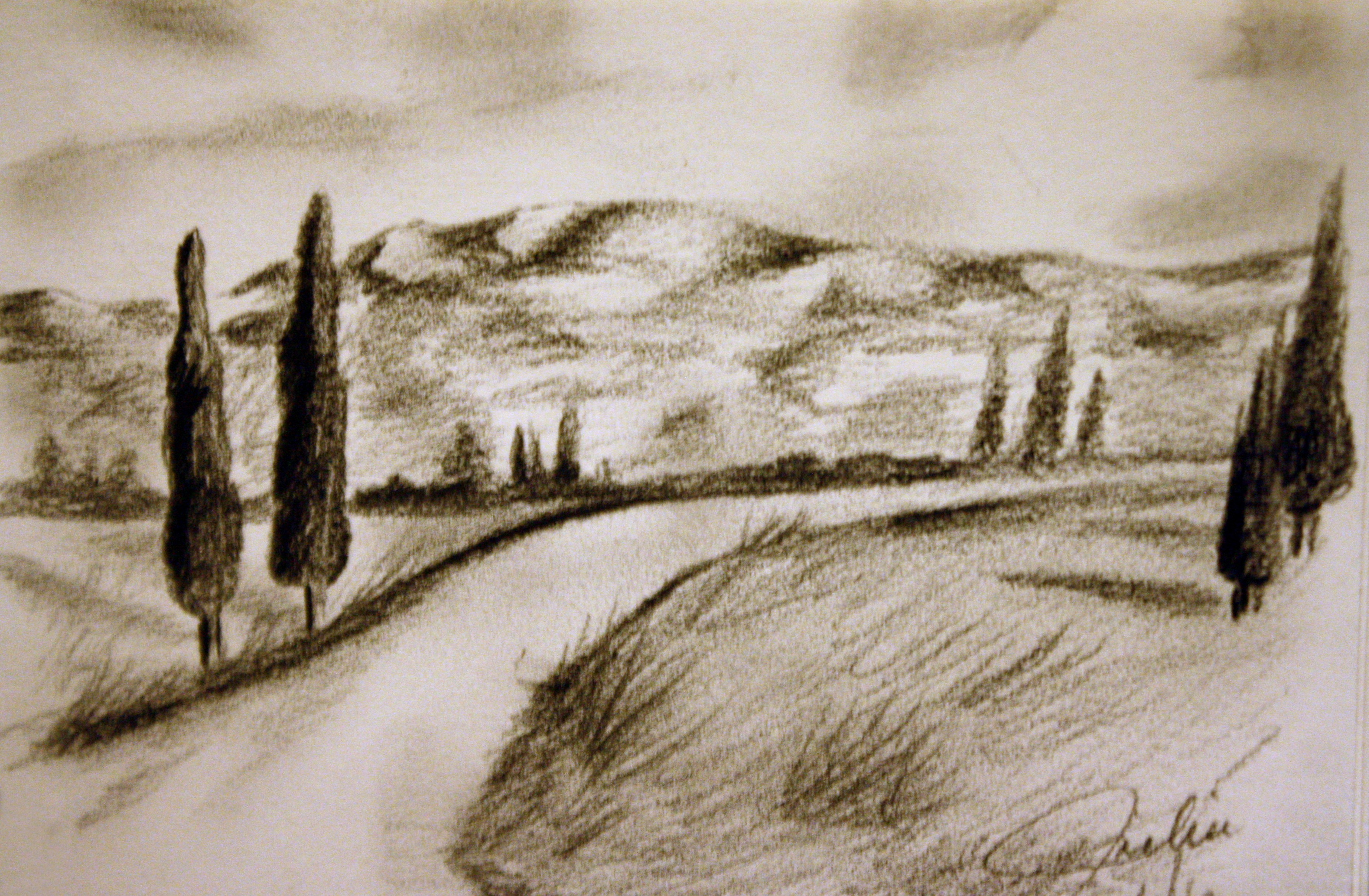 So I sit here looking around this very noisy place for inspiration, and quite frankly it isn’t coming. I personally cannot get enough quiet, particularly when I am working. I, in a desperate attempt to find something, began looking through our phones at our photos, and then it hit me. Why not just create the place I’d like to be? I had only a pencil and a small sketch pad so I did a little drawing of a quiet meadow in the countryside. Just a quick post, and quick sketch, gotta get back to the game and my date. In case you are curious, Hawks win!